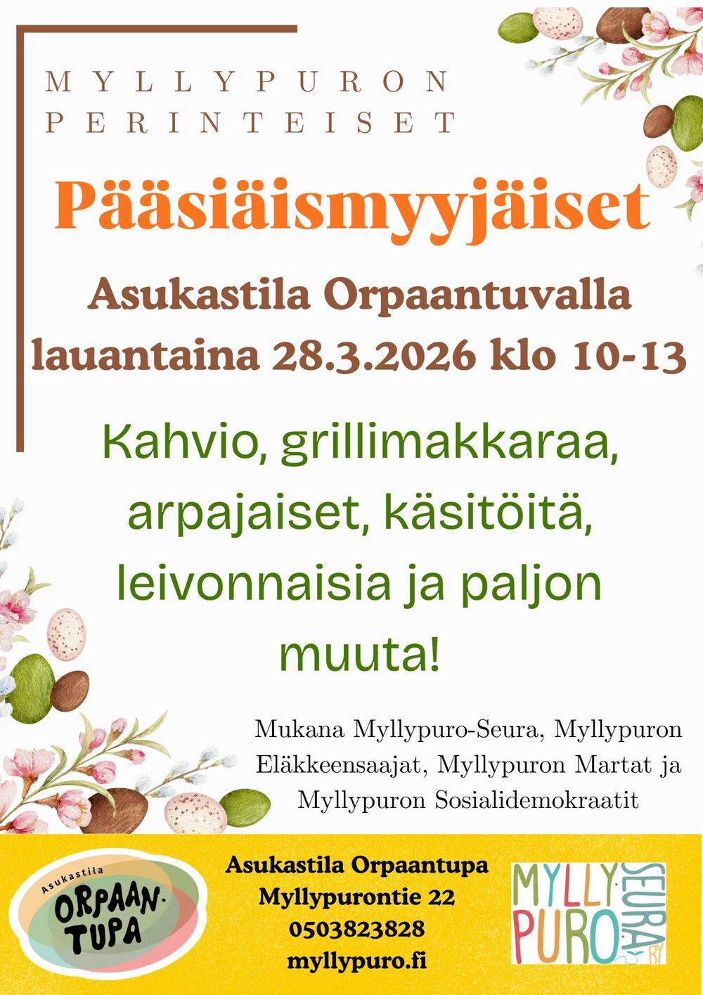 Osallistumme 28.3.2026 Asukastila Orpaantuvalla, Myllypurontie 22 Pääsiäismyyjäisiin. Meillä on arpajaiset ja myyntituotteita.